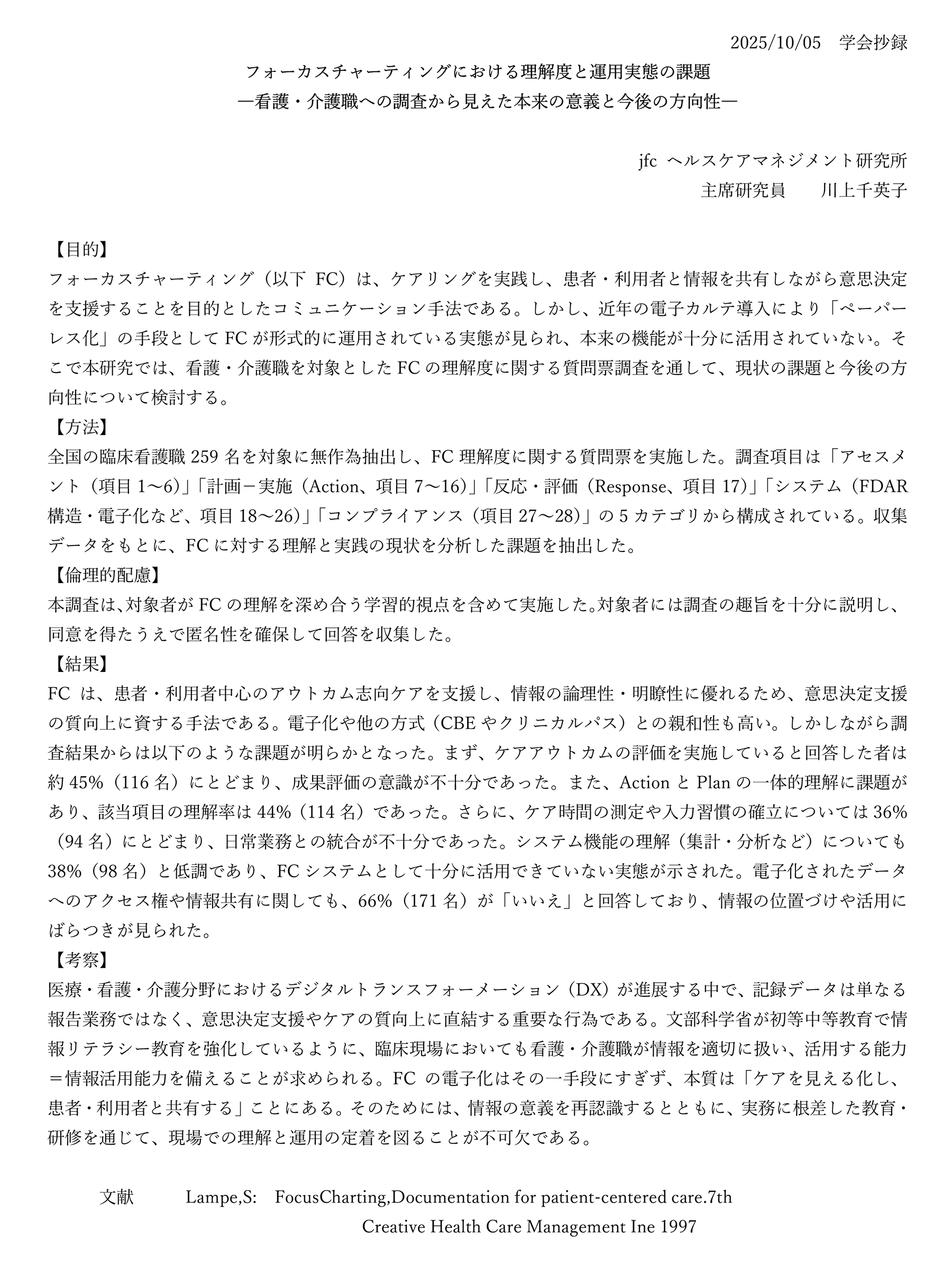 このたびは「FC理解度質問票調査」にご協力いただき、誠にありがとうございました。